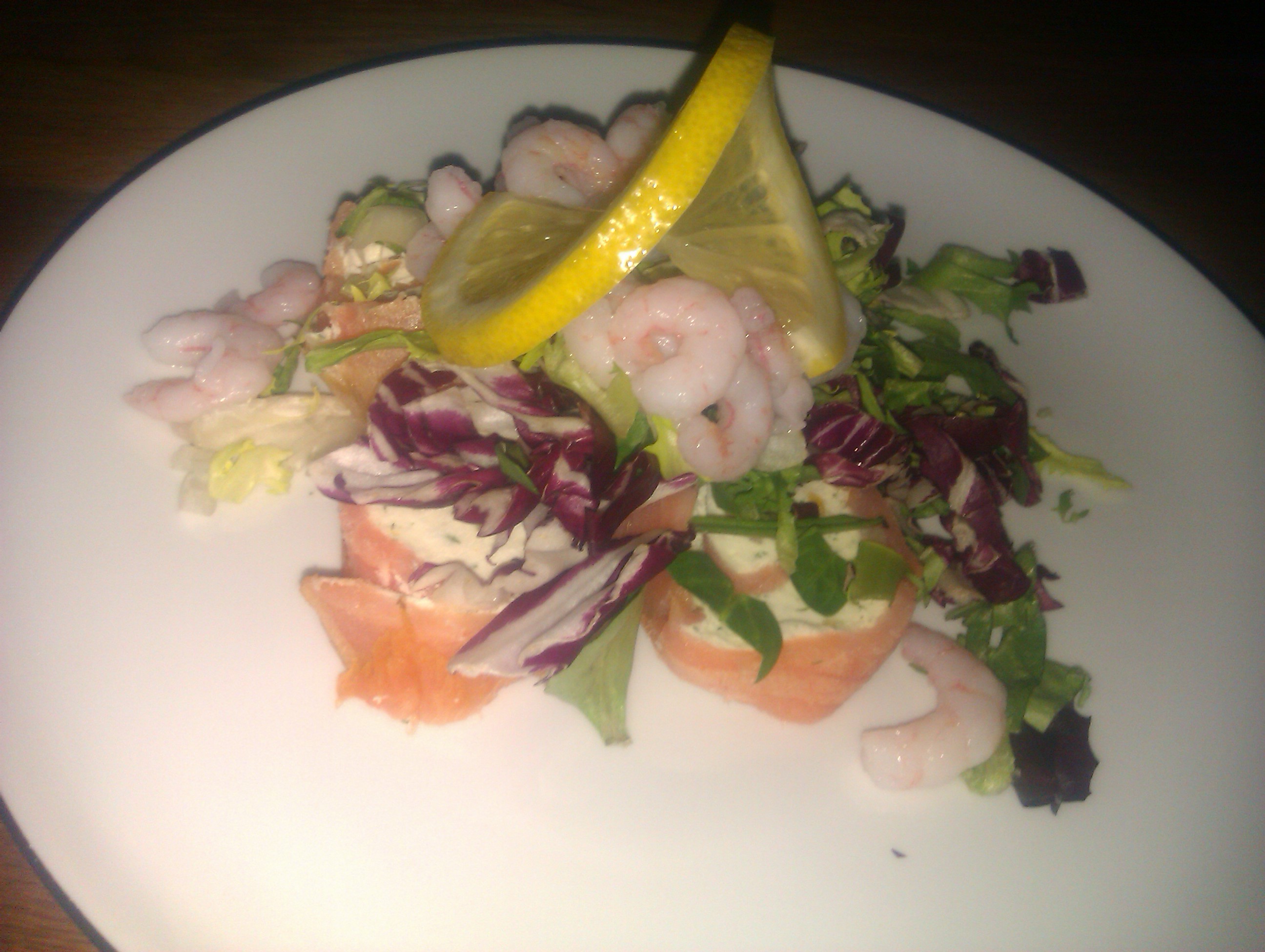 Bland olie og citronsaft, og vend det i salaten sammen med salt og peber. Fordel salaten oven på lakserouladeskiverne, og pynt med plukket dild og rejer. Server med flute.