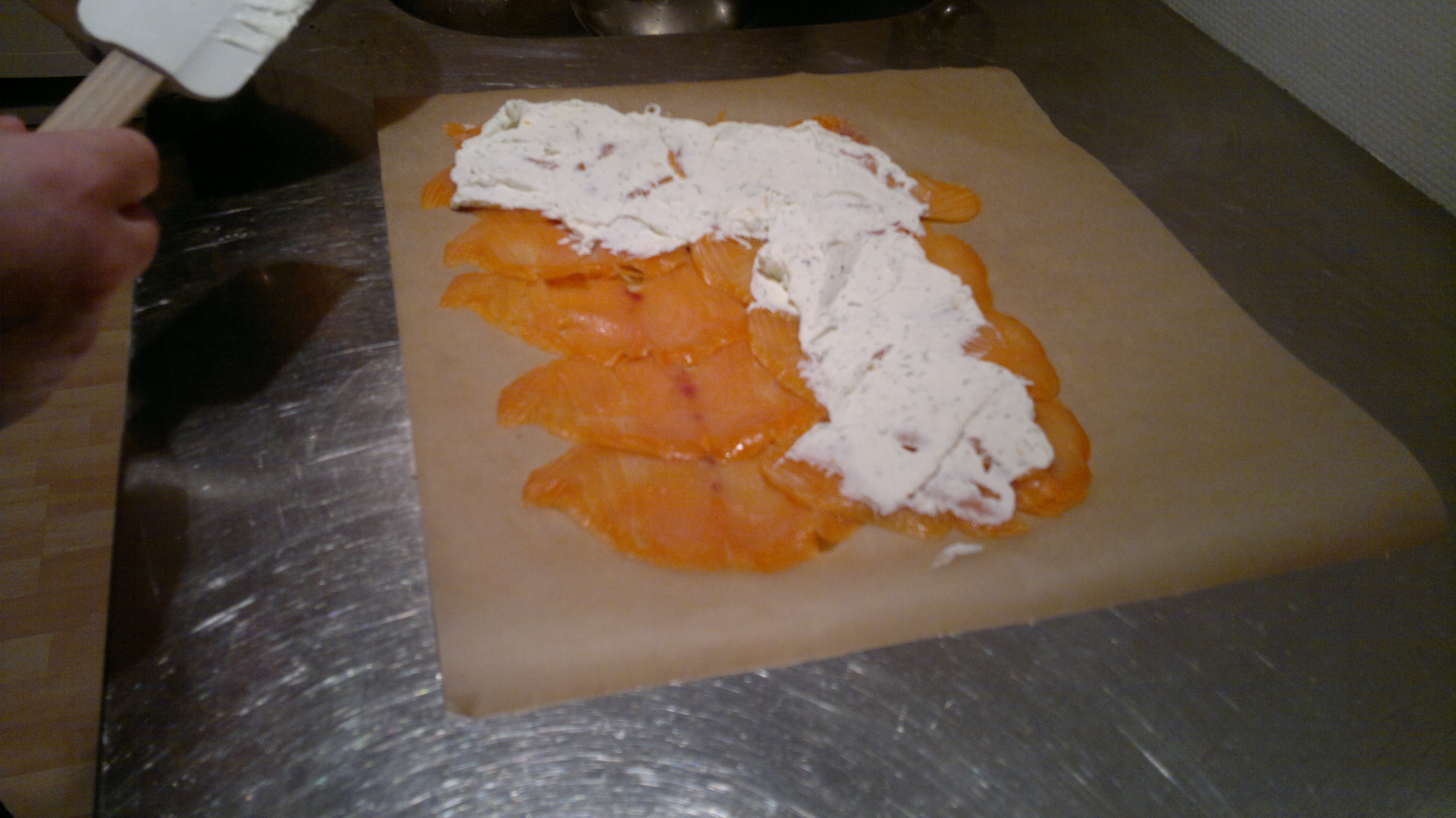 Smør dildcremen ud på laksefirkanten og rul laksefirkanten sammen som en roulade fra den lange side. Fortsæt med at rulle rouladen sammen ved at hive i papiret foroven. Fold papiret om lakserouladen.