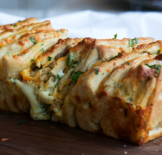 Bland ost, hvidløg, salt, peber og hakket persille. Rul dejen ud til en stor firkant og fordel osten derpå. Skær derefter lange strimler der passer i størrelsen til bredden minus 1-2 cm på din brødform.